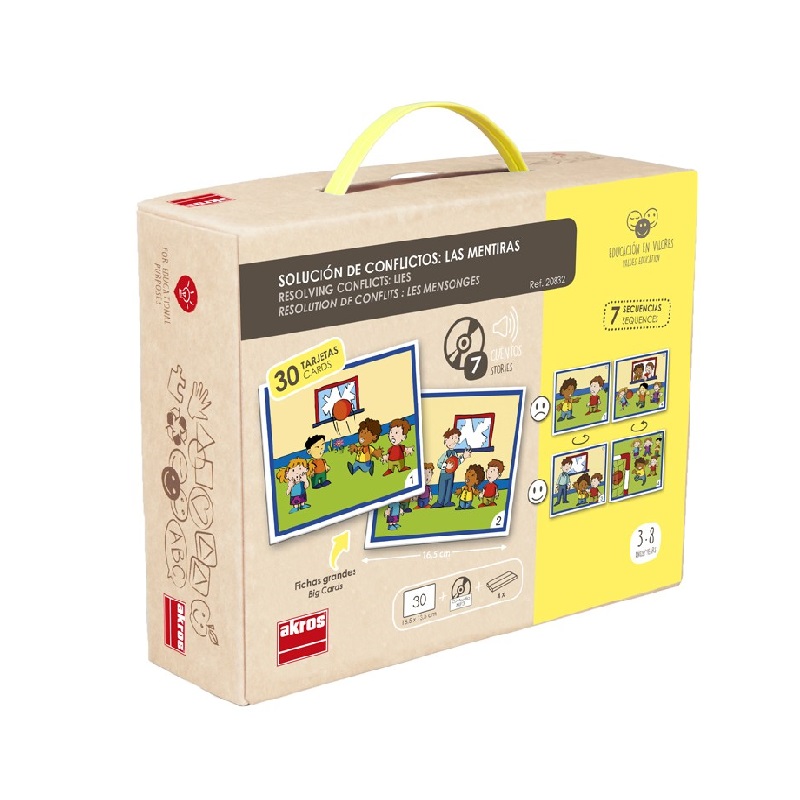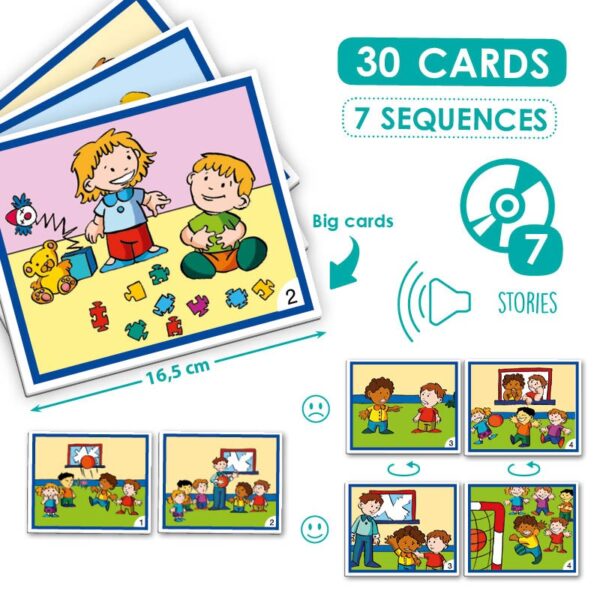 Sadržaj: 30 kartica dim.13,5×16,5 cm s, MP3 CD sa 7 priča na 14 različitih jezika, 4 drvena stalka za kartice, te upute za igru.