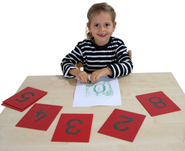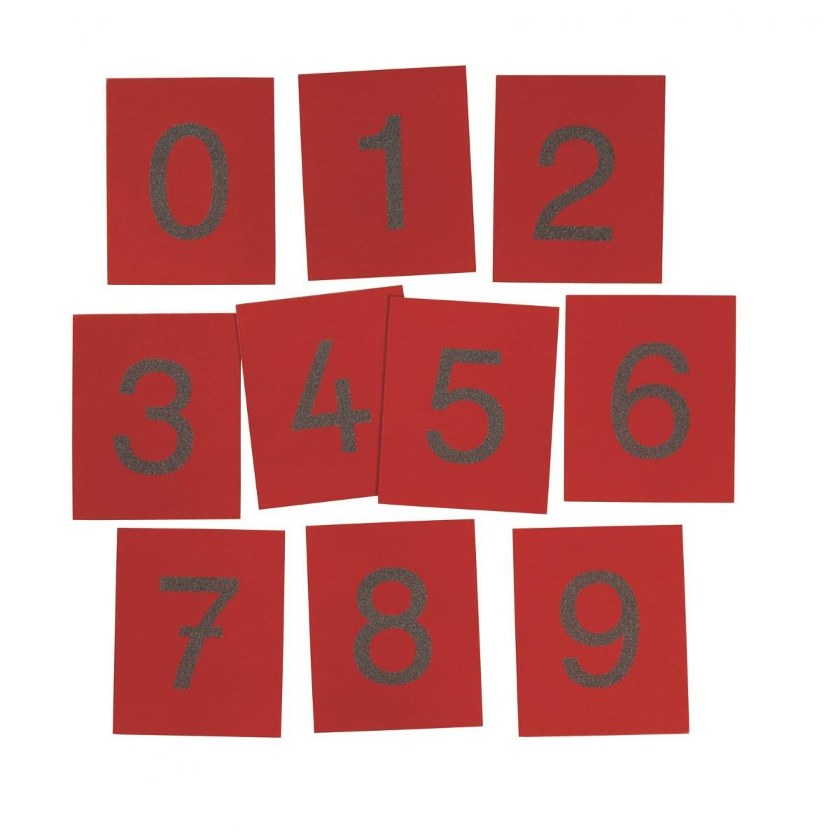 Set od 10 brojeva izrezanih od brusnog papira, na drvenoj podlozi (16×13 cm). Svrha im je učenje numeričkog broja. Gruba površina brusnog papira sam postupak mentalnog usvajanja oblika nekog broja čini učinkovitijim i interesantnijim. Kutija nije dio seta, zasebno se naručuje (59-89395). Odgovara svim zahtjevima posebnog Montessori obrazovnog koncepta.