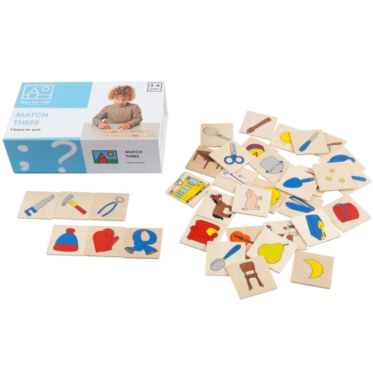 Igrajući ovu igru djeca uče sortirati i klasificirati dok istovremenu bogate svoj vokabular. Cilj igre je sortirati drvene kartice sa slikama i sastaviti skupove od 3 koji pripadaju istoj temi. Kako bi proširili vježbu,djeca mogu imenovati svaku slikovnu karticu i objasniti odnos između te tri kartice. Sadržaj: 36 drvenih kartica (5×5 cm) pakirano u kutiju s magnetnim zatvaranjem dim.21x12x6 cm